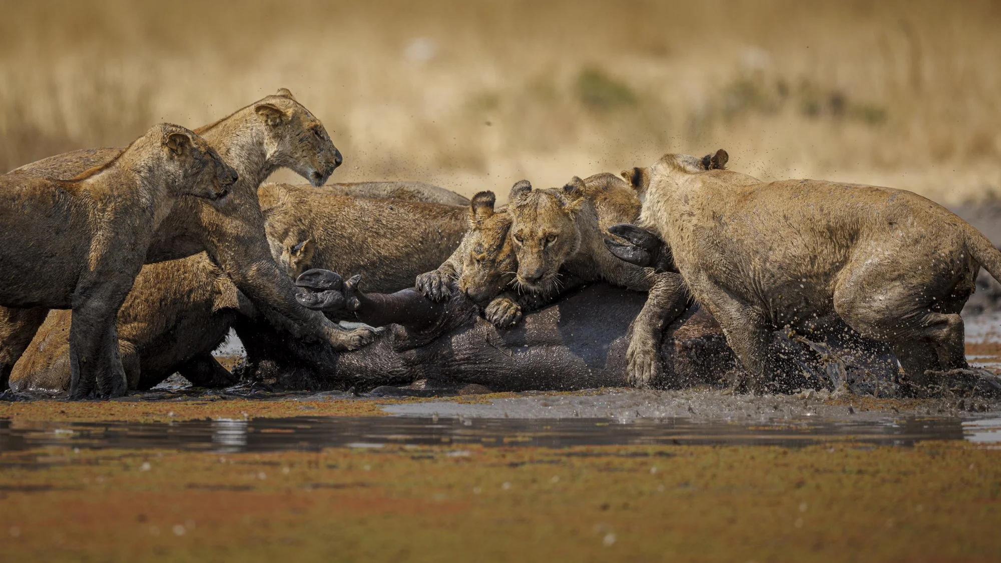 Russell captured the sequence with a drone, his camera hovering above as the lions brought down their prey. As he filmed, I photographed from an adjacent window, careful not to cause any unnecessary movement in the vehicle. The result was a set of images that not only documented the hunt but gives an intimate view of lionesses at the height of their power.